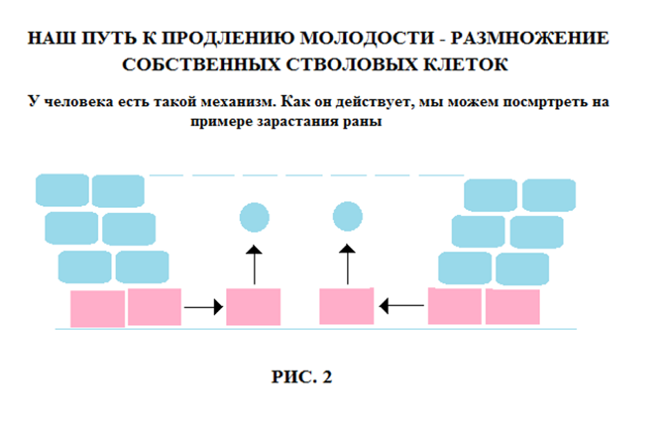 Вывод: нужен другой путь для обновления клеток ткани. А почему бы не попробовать путь стимулирования собственных стволовых клеток к размножению? Тем более, что такой механизм у человека есть. Механизм регенерации тканей ярко проявляется во время ранения. Организм резко начинает плодить клетки, чтобы восстановить разрушенную ткань. Причем, делает он это в два этапа. Сначала стволовые клетки размножают себя (Рис.2 процесс 1), затем они начинают восполнять зрелые клетки ткани (Рис.2 процесс 2).