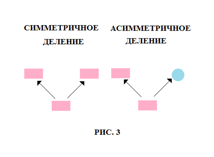 Здесь мы наткнулись на интересный момент. Оказывается, стволовые клетки могут подвергаться разным механизмам деления. Рассмотрим два из них: симметричное деление и асимметричное (Рис.3). В первом случае обе дочки похожи на мать. С помощью такого механизма стволовые клетки умножают свою популяцию. Во втором случае одна дочка похожа на мать, а вторая является зрелой клеткой ткани. С помощью второго механизма стволовые клетки пополняют ткани и в то же время поддерживают свою численность.