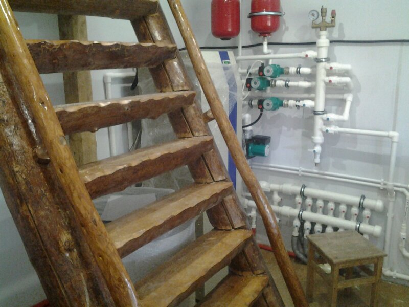 Вот, теперь я могу хвастаться. Те самые "краси-и-ивые" кровать и лестница. Жаль, с цветопередачей у планшетки не очень, но хотя бы так. А за лестницей - насос геотермальный. Это моё отопление и ГВС, от тепла земли работающее. Буду теперь в новом доме в тепле! И душ! И унитаз, а не домик заседаний во дворе!!! А ещё летом от насоса фанкойл работает, воздух охлаждать будет. |