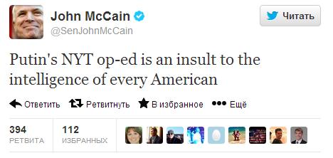 "Путин очень хорошо написал. Обычно я ненавижу постить всякие политические штуки, но, думаю, эти слова выражают очень многие мои мысли. Посоледнее предложение такое: Мы разные, но когда мы просим Господа благословить нас, мы не должны забывать, что Бог создал нас равными." Это точно не американская война".