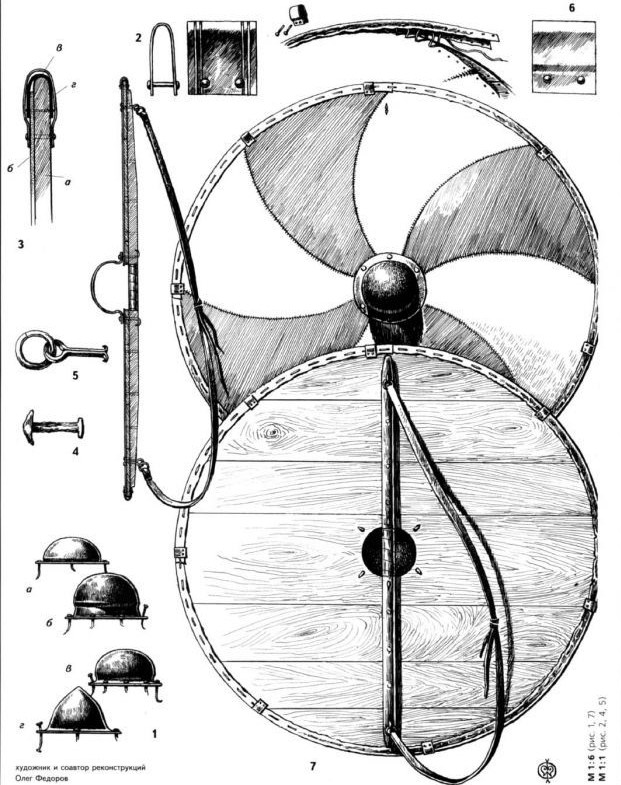 ...... сочетая скандинавские и древнерусские материалы, можно представить примерную реконструкцию одного из типов щитов, имевшего распространение в X в. как на территории Древней Руси, так и на территории Скандинавии.
