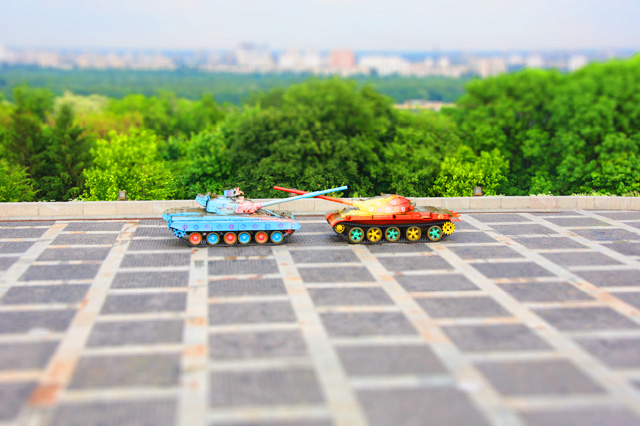Для примера я взял вот эту: http://s001.radikal.ru/i193/1001/e7/dabe351c69a7.jpg Открываем ее, кадрируем, изменяем размер до нужного. Думаю, это Вы умеете делать. После этого: 1. Выбираем режим "Быстрой маски" нажав клавишу Q. 2. Выбираем инструмент "Градиентная заливка" выбрав режим заливки от "Основного к фоновому" и "Зеркальный градиент" http://s003.radikal.ru/i201/1001/59/98312c0dad60.jpg 3. Проводим линию снизу вверх (если при этом держать Shift, то линия получится идеально вертикальная) http://i073.radikal.ru/1001/03/76137b8740d9.jpg и получаем вот такую маску: http://s001.radikal.ru/i194/1001/6b/cb0d51fd211c.jpg 4. Выходим из режима "Быстрой маски" нажав Q и получаем выделение снизу и сверху. Тут важно, чтобы то, что мы не размываем оказалось достаточно далеко от выделения. Если не получится - можно еще раз нажать Q и снова провести линию. Как показывает опыт - линию надо проводить от середины "игрушек" за край картинки. http://s55.radikal.ru/i149/1001/e1/6ff35187f897.jpg 6. Выбираем "Фильтр" - "Размытие" - "Размытие по малой глубине резкости" и настраиваем степень размытия по своему вкусу и нажимаем OK. http://s40.radikal.ru/i090/1001/ee/05fd88185f08.jpg 7. Снимаем выделение, нажав CTRL-D. Важный шаг - я всегда о нем забываю. 8. Теперь можно чуточку осветлить нажав CTRL-M и поиграв кривой http://s005.radikal.ru/i212/1001/a7/d11703e28215.jpg 9. Добавляем насыщенности CTRL-U. Насыщенность должна быть за порогом "разумного" - тогда эффект "игрушечности" будет сильнее. http://s001.radikal.ru/i193/1001/b2/94f1332b1df5.jpg В итоге получаем картинку: http://intellegens.ru/forum/picture....pictureid=1026 Кошмар, в общем. :D Цитата: