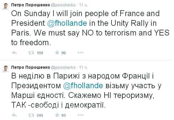 «В воскресенье в Париже с народом Франции и президентом Олландом приму участие в Марше единства. Скажем — нет терроризму, да — свободе и демократии», — объяснил свое решение украинский президент.