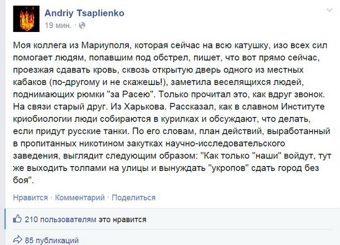 Тем временем Захарченко объявил о том что Мариуполь город в котором живут жители того же региона что и Донбасс и потому своих людей он не бросит в беде. Четыре пятых населения Мариуполя за Донбасс. И чтобы там теперь не лгали украинские СМИ, а победа будет за ДНР! Поскольку видно по хорошему украинцы не понимают. Значит пора по тому пути, по которому идти правильно и силой восстанавливать мир на Украине. Украина возжелала? Год войны им судя по всему мало? Хорошо! Будут им *победы* их мракобесия их неразумной власти, которой нет. От увиденного на поле боя Турчинов аж и тот посерел, от страха, от ужаса. Ну, ну.. Коломойскому надо показать на что тот тратит последние вытащенные из кармана украинцев деньги.