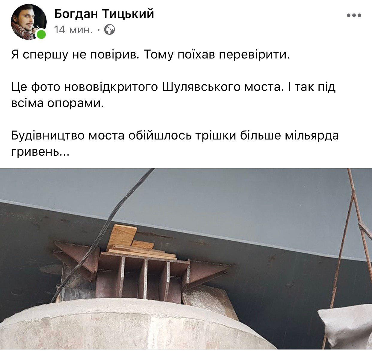 Шулявский мост был торжественно открыт в Киеве 27 декабря. В качестве церемонии открытия по нему пустили восемь тяжёлых грузовиков. А за неделю до этого был репортаж, какие работы там заканчивались. Бетонные в том числе. Так вот испытывать их нужно в таком случае не раньше 7-10 января. И мост открывать. Не, грузовики проехали. Мост открыли. А чего там с бетоном приключилось - проверили? Через год-полтора следующий миллиард гривен на реконструкцию?