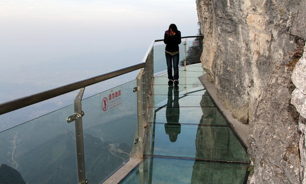 В Китае туристы гуляют по стеклянной "тропе" на высоте 1,2 километра. Необычный маршрут открылся вдоль отвесного склона горы Тяньмэнь (провинция Хунань). Любители экстремальных развлечений гуляют по "воздушной дороге" шириной около метра. Толщина стекла составляет примерно 6,4 см.