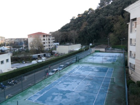 Это. значит, теннисные корты. По тому, что вода на них застыла видно, что нифига не тепло, и цветочки возле дома сие подтверждают.