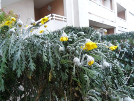 Это. значит, теннисные корты. По тому, что вода на них застыла видно, что нифига не тепло, и цветочки возле дома сие подтверждают.