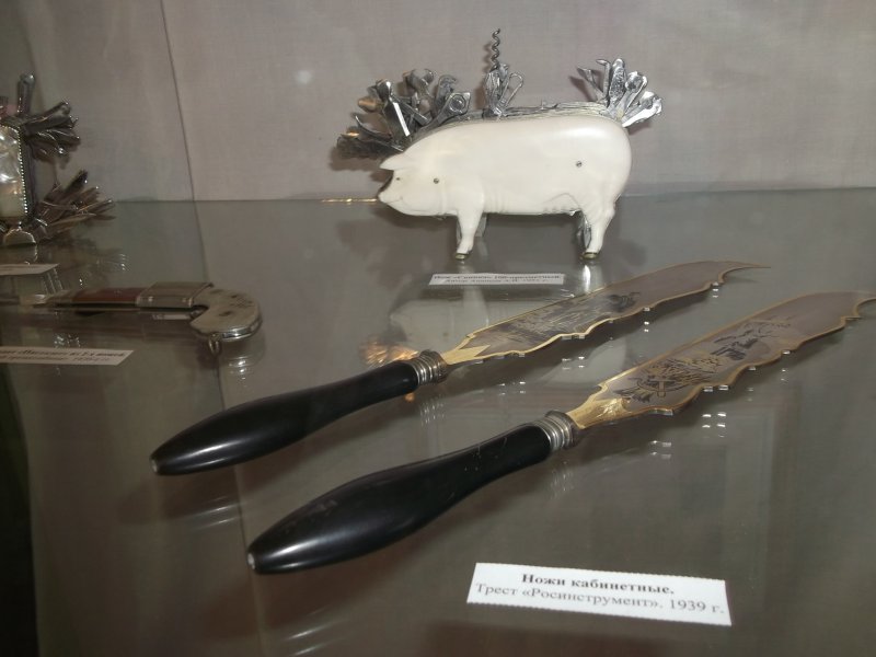В музее я сфотографировала миниатюрные сувенирные ножи, но, наверное, эти снимки надо где-то в другом месте выложить. Это уже не клинки, а просто образчики мастерства ремесленников.