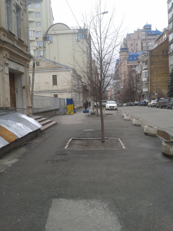 Фотка сделана у входа в метро. Вся огромная стена закрашена в цвета флага, сверху вдоль дороги такие же заграждения.
