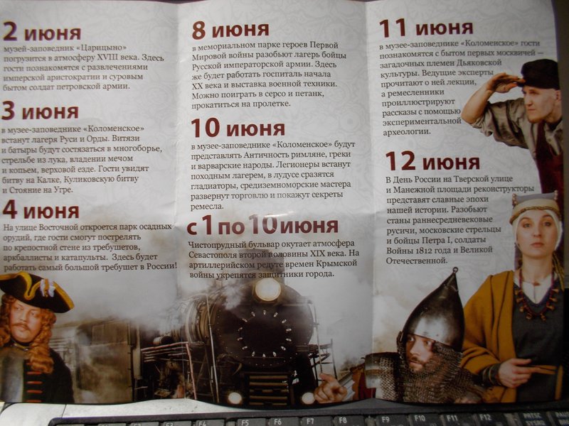 Еще раз и по-порядку... Исторические фестивали в этом году проходили не только в Москве и Питере. Они проходили по довольно многим городам. Точно отписывались из Вологды. Многих ребят знаю лично. Про Москву - ВСЯ программа фестиваля БЫЛА ИЗВЕСТНА даже для публики месяца за три (не говоря про интересующихся). У меня на руках ПЕЧАТНАЯ программа всех 12 дней фестиваля, по всем точкам в городе, в том числе и финальный "парад" на ТВЕРСКОЙ. Под эти мероприятия специально ЕХАЛИ иностранные реконы, а для привоза такого количества снаряги, как ты понимаешь - билеты надо брать не за один день. (Я по секрету скажу - у нас уже висит анонс на СЛЕДУЮЩИЙ год!)