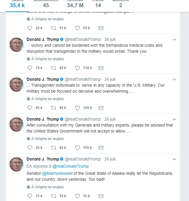 «После консультации со своими генералами и военными специалистами, пожалуйста, примите во внимание, что правительство Соединенных Штатов не будет принимать или разрешать трансгендерам служить в любом качестве в Вооруженных силах США», – написал глава Белого дома в своем Twitter