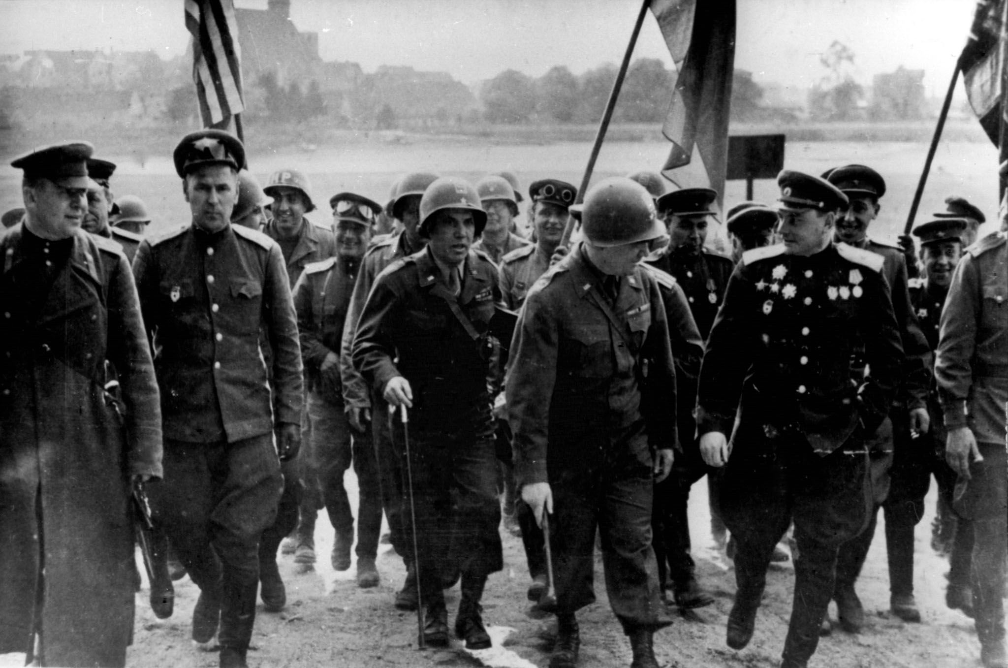 Странная фотка. Советский в форме, но без погон, и на фоне странного флага. Уж не Власовский ли случайно? Советский же одноцветный. Да и у американца весь корпус туловища замазан чёрным.