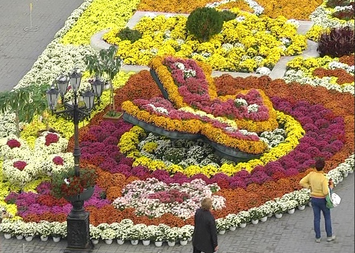 Конечно, внимание привлекает цветочная композиция. В этом году она по — летнему яркая. Огромная бабочка, составленная из горшочков с хризантемами, сидит на цветочном лугу. Красиво и оригинально. Осталась и полюбившаяся многим в прошлом году цветочная пирамида.