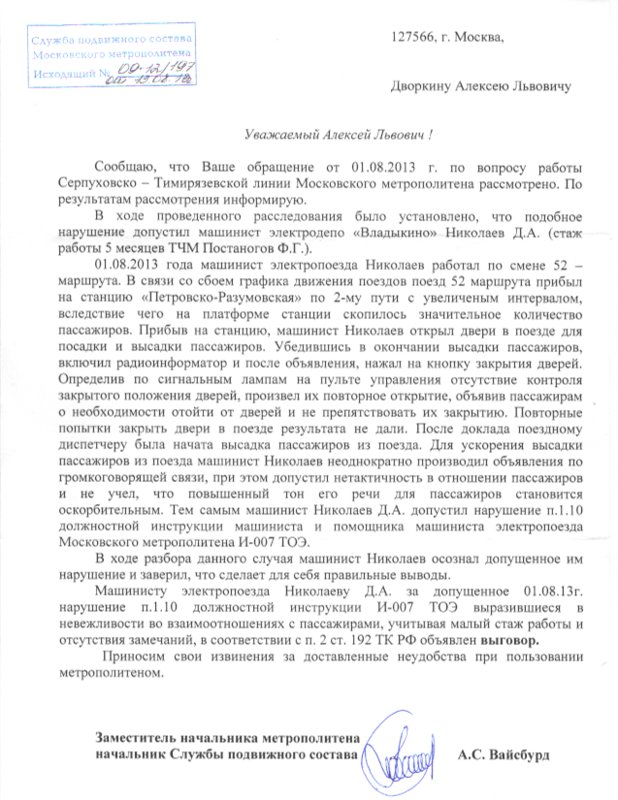 Мне пришло извинение от руководства метрополитена за тот случай.