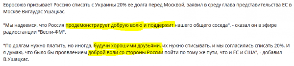 Россия должна поддержать Украину как «хорошего друга» и списать ей 20 процентов долга. Об этом заявил в интервью радиостанции «Вести-FM» постпред Евросоюза в РФ Вигаудас Ушацкас.