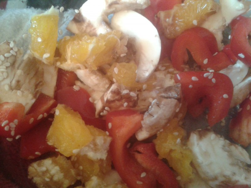 в салате перец, апельсин, шампиньоны и кунжут ) и все это бальзамиком сбрызнуто. Вообще там очень хорошо зелень салатная смотрится