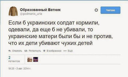 P.S. А вообще, те, кто замутил майдан и прибрал потом к рукам власть, те пусть и спонсируют войну, нанимают профессиональную армию, оплачивают народу свет и тепло. Где, б@ять, 1000 гривен в день и миллион страховки?! Где реальная помощь Европы и Америки?! Где, б@ять, вашу мать?!