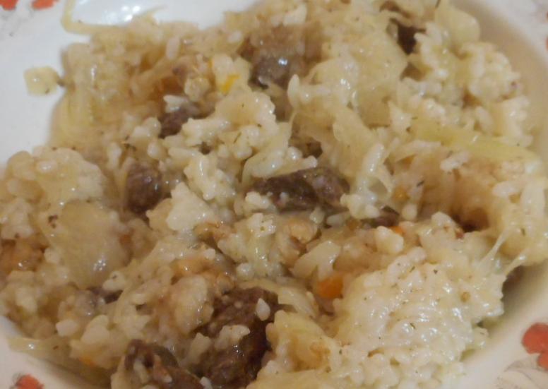 Сделал наконец-то мульгикапсад. Поскольку на даче, пришлось обходиться тем, что есть, зато готовил в условиях, приближенных к естественным. Говядины не было, свинины не было, было свиное сало и лосятина, решил что для деревенского блюда такая замена приемлема. Капусты оказалось мало, потому что я много съел вилкой, и исходил уже не из рецепта, а из наличия. Думаю, для крестьянской пищи это тоже нормально. Перловку взять забыл, заменил рисом, и очень понравилось. Много лучше, чем просто каша, по уровню качества примерно как плов.